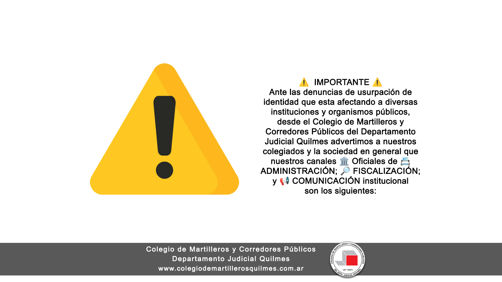 Ante las denuncias de usurpación de identidad que esta afectando a diversas instituciones y organismos públicos, desde el Colegio de Martilleros y Corredores Públicos del Departamento Judicial Quilmes advertimos a nuestros colegiados que nuestros canales 🏛️ Oficiales de 📇 ADMINISTRACIÓN; 🔎 FISCALIZACIÓN; y 📢 COMUNICACIÓN institucional son los siguientes: