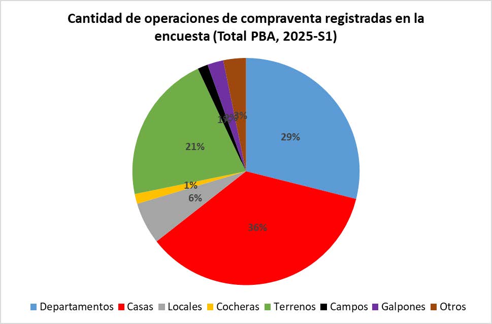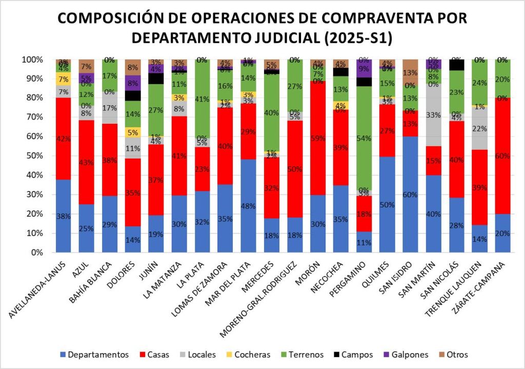El relevamiento estadístico —correspondiente al primer semestre de 2025— arrojó que el 65% de las operaciones de compraventa corresponde a casas y departamentos, aunque se observa un incremento en la participación de terrenos. En otras palabras, dos de cada tres operaciones involucran viviendas, mientras que el interés por los terrenos crece hasta alcanzar el 21% del total. Este dato confirma que el mercado continúa siendo predominantemente residencial, con una demanda que se reorienta hacia nuevas urbanizaciones y loteos en zonas intermedias y del interior provincial.