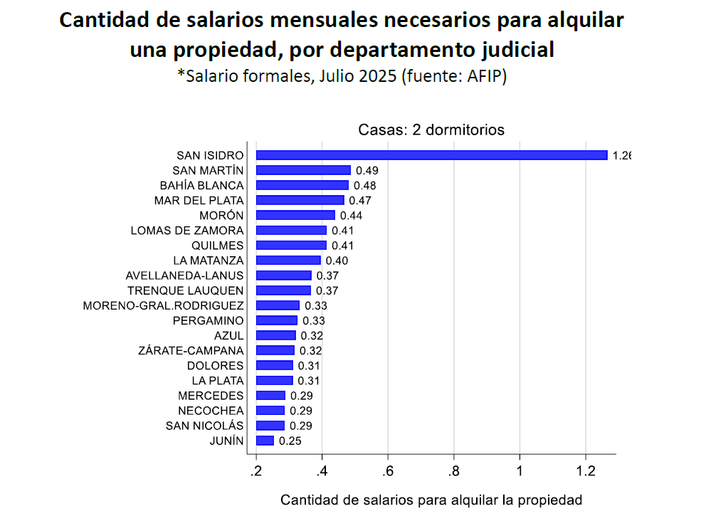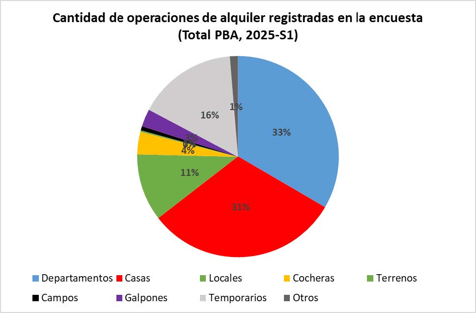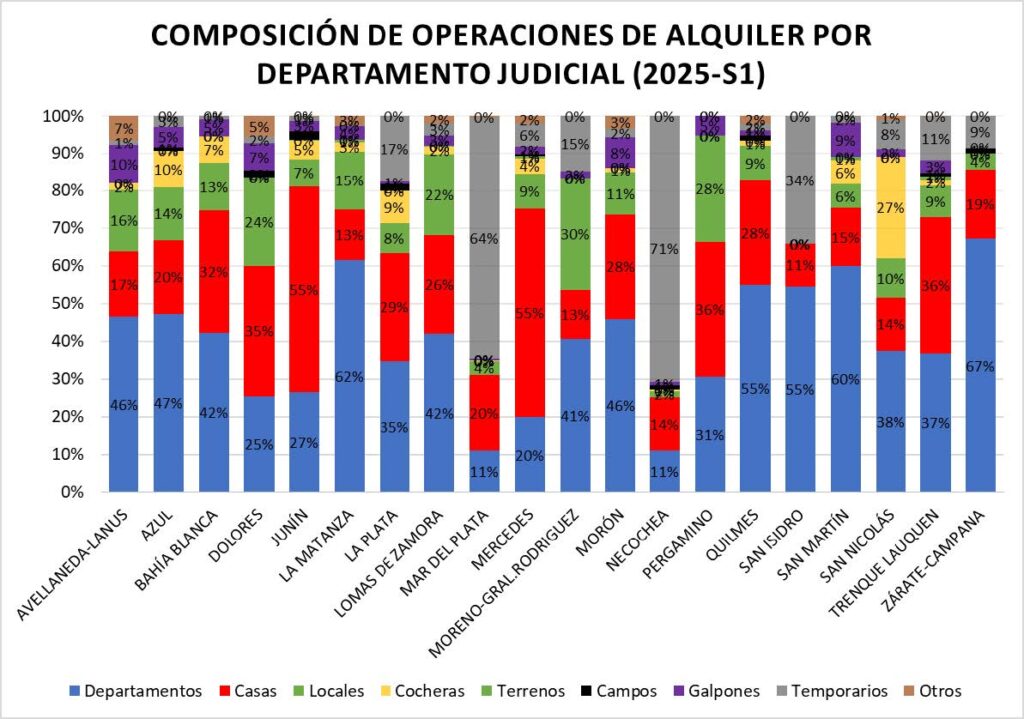 En cuanto a los alquileres, estos son liderados por los departamentos, seguidos por las casas. Los alquileres temporarios muestran una fuerte presencia en los departamentos judiciales costeros de la provincia. El valor promedio equivale al 36% del salario formal, lo que ubica a gran parte de los inquilinos en el límite del umbral de asequibilidad recomendado internacionalmente.