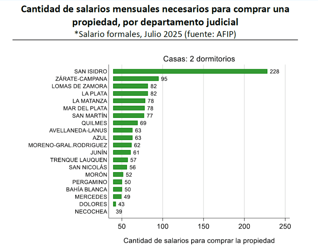 En materia de accesibilidad, en el territorio bonaerense se requieren 65 salarios formales para adquirir una vivienda tipo de dos dormitorios, considerando que el salario promedio formal en julio de 2025 fue de $1.524.216. Este indicador —equivalente a más de cinco años completos de ingresos— evidencia las dificultades que enfrenta la población para acceder a la vivienda propia.