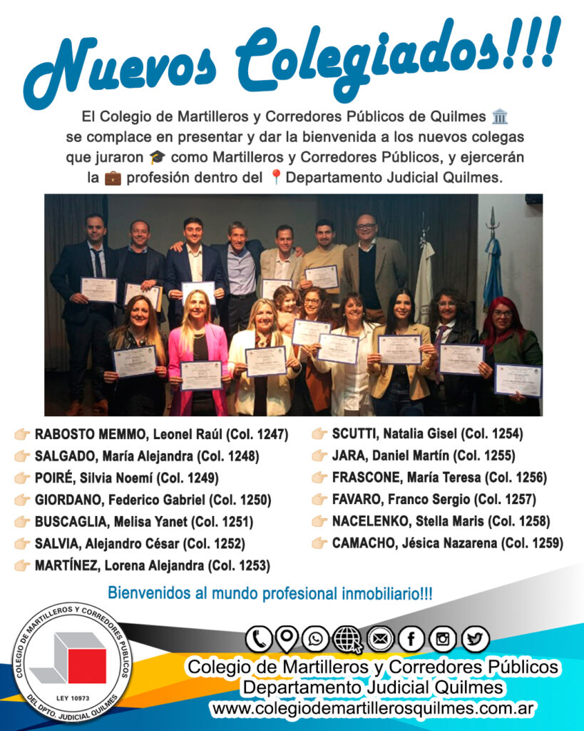 El Colegio de Martilleros y Corredores Públicos de Quilmes 🏛️ se complace en presentar y dar la bienvenida a los nuevos colegas que juraron 🎓 como Martilleros y Corredores Públicos, y ejercerán la 💼 profesión dentro del 📍Departamento Judicial Quilmes.